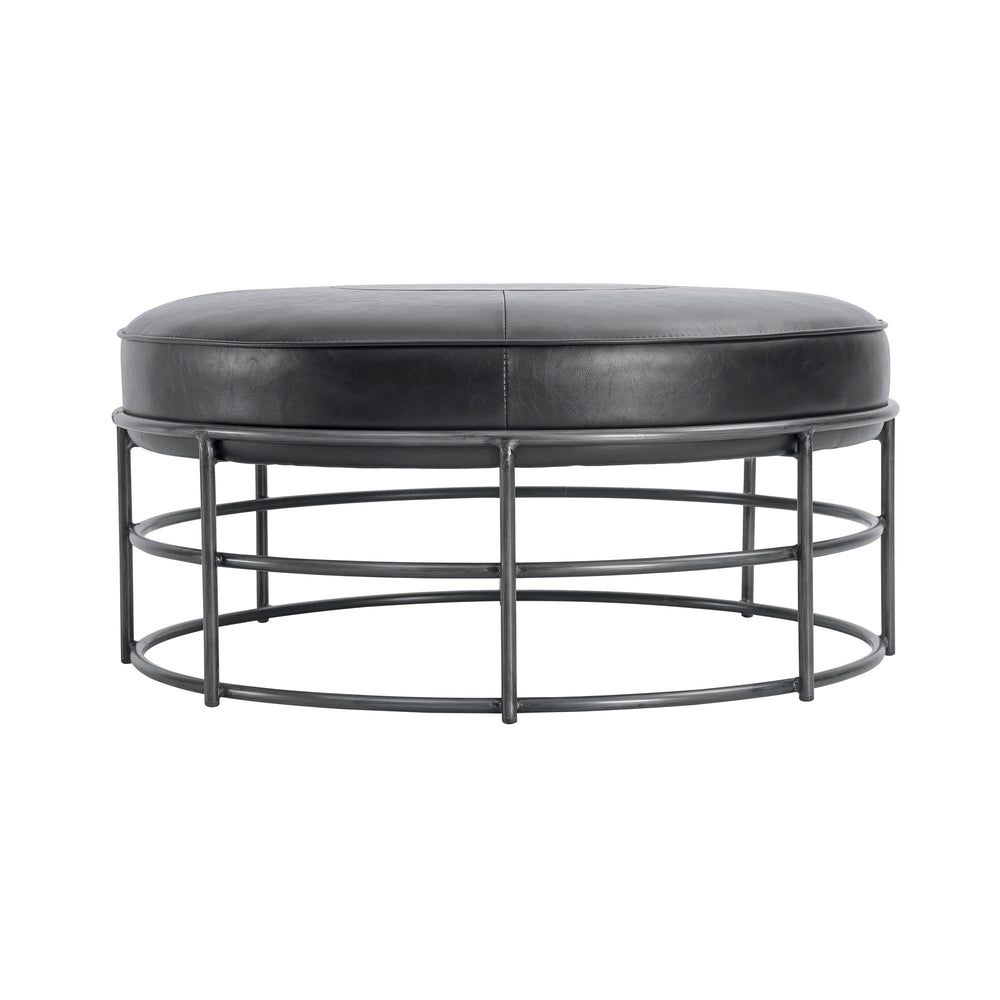 Round and versatile, this low-profile ottoman mixes smooth faux leather with subtle stitching for a clean, casual finish.