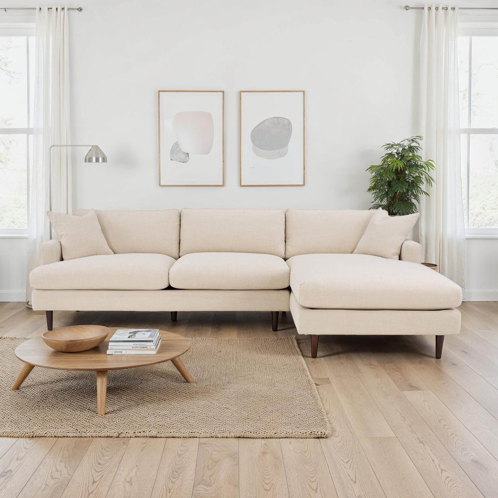 Frame Construction: Solid Wood, Plywood, Elasticized Webbing, S-Spring; Alligator clips to secure sectional together; Legs: Rubberwood; Seat Cushion: High Density Foam, Feathersoft Seating; 50% Feather, 50% Fiber Blend; Back Cushion: Fiber; Pillows: 100% Fiber; Fabric: 100% Polyester;