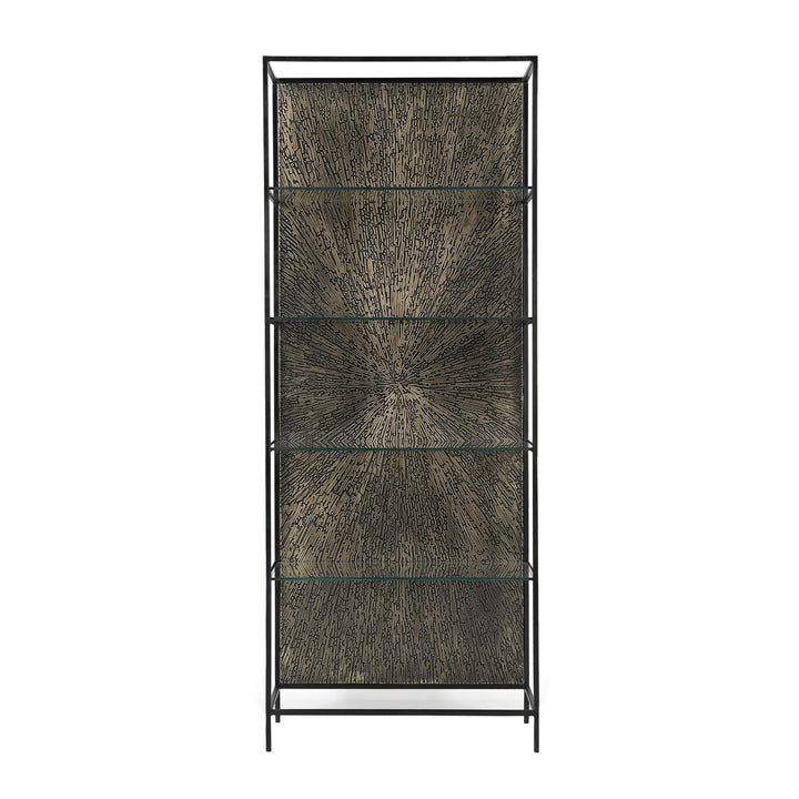 • Striking and architectural, the Venus Bookcase stands tall with its glass shelving and bold brass-patterned back panel—designed to showcase and elevate.