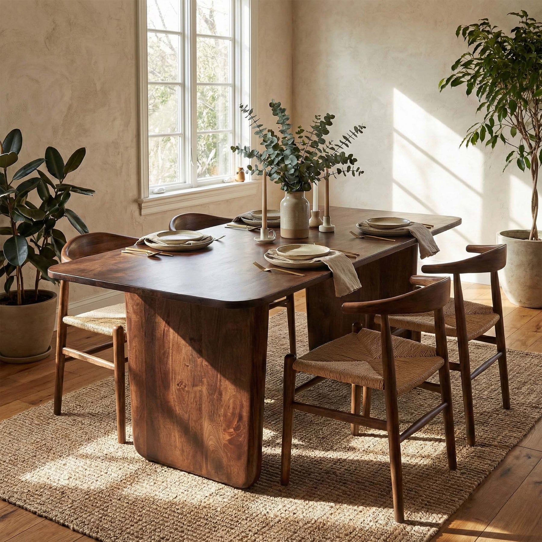 A compact dining solution with sculptural legs and a warm mango wood finish. Its space-conscious design seats six comfortably without compromising modern style.- Solid mango wood