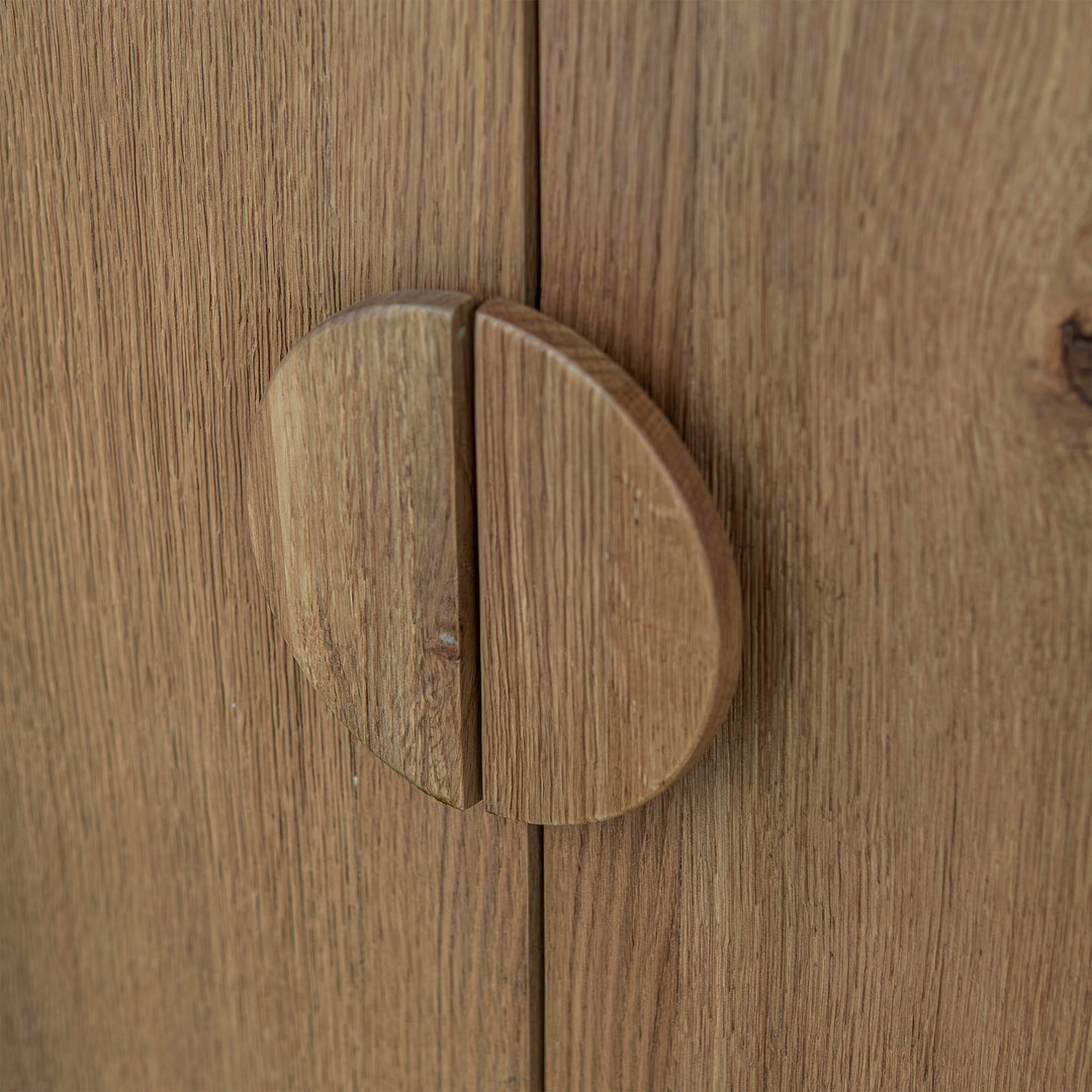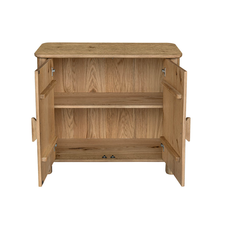 This sideboard in Brown provides practical storage with two concealed cabinet doors, ideal for organizing dining essentials or living room items. Its cracked oak pattern texture adds subtle character, while rounded legs and soft edge details create a smooth, inviting silhouette. Compact and versatile, it fits well in dining rooms, entryways, or smaller living spaces.