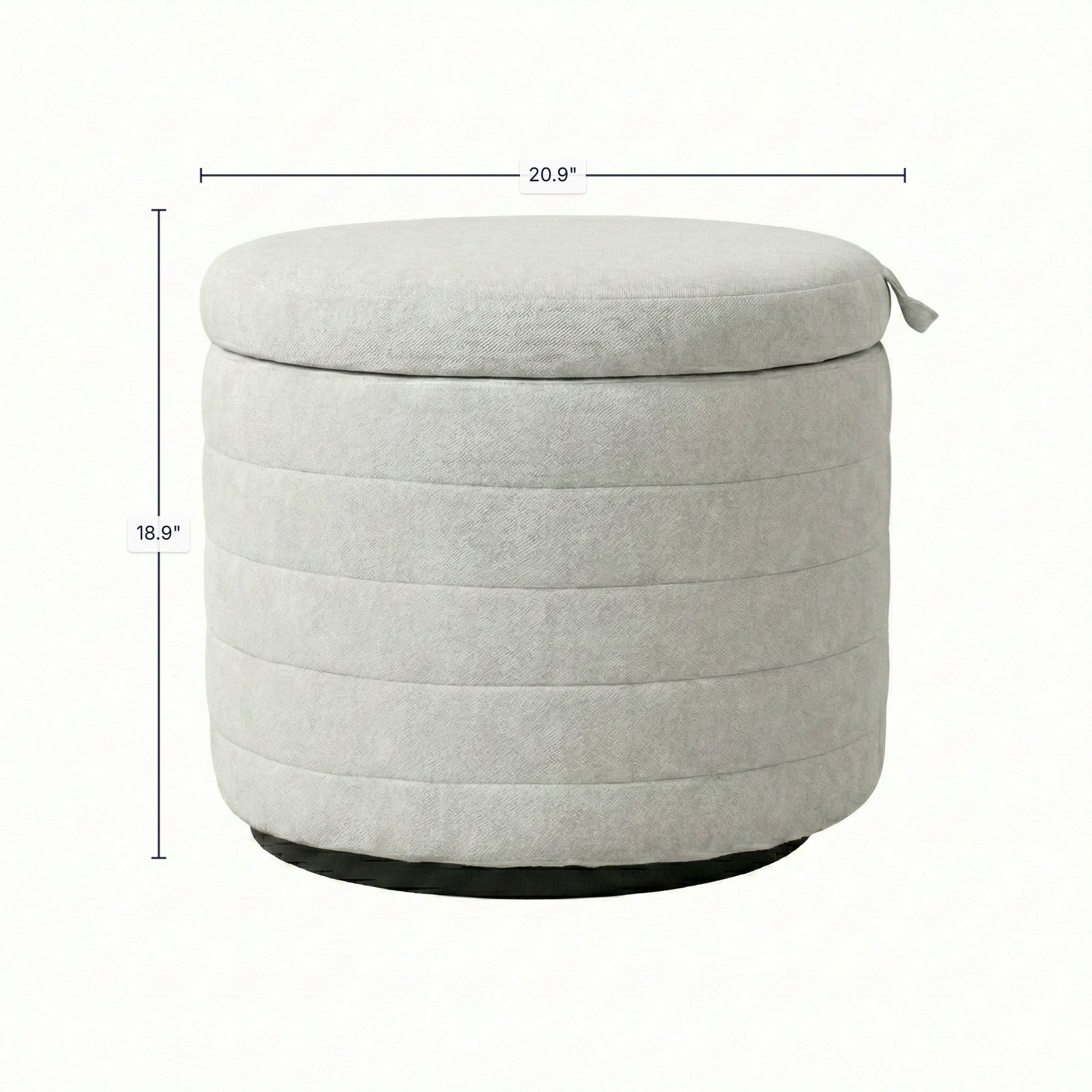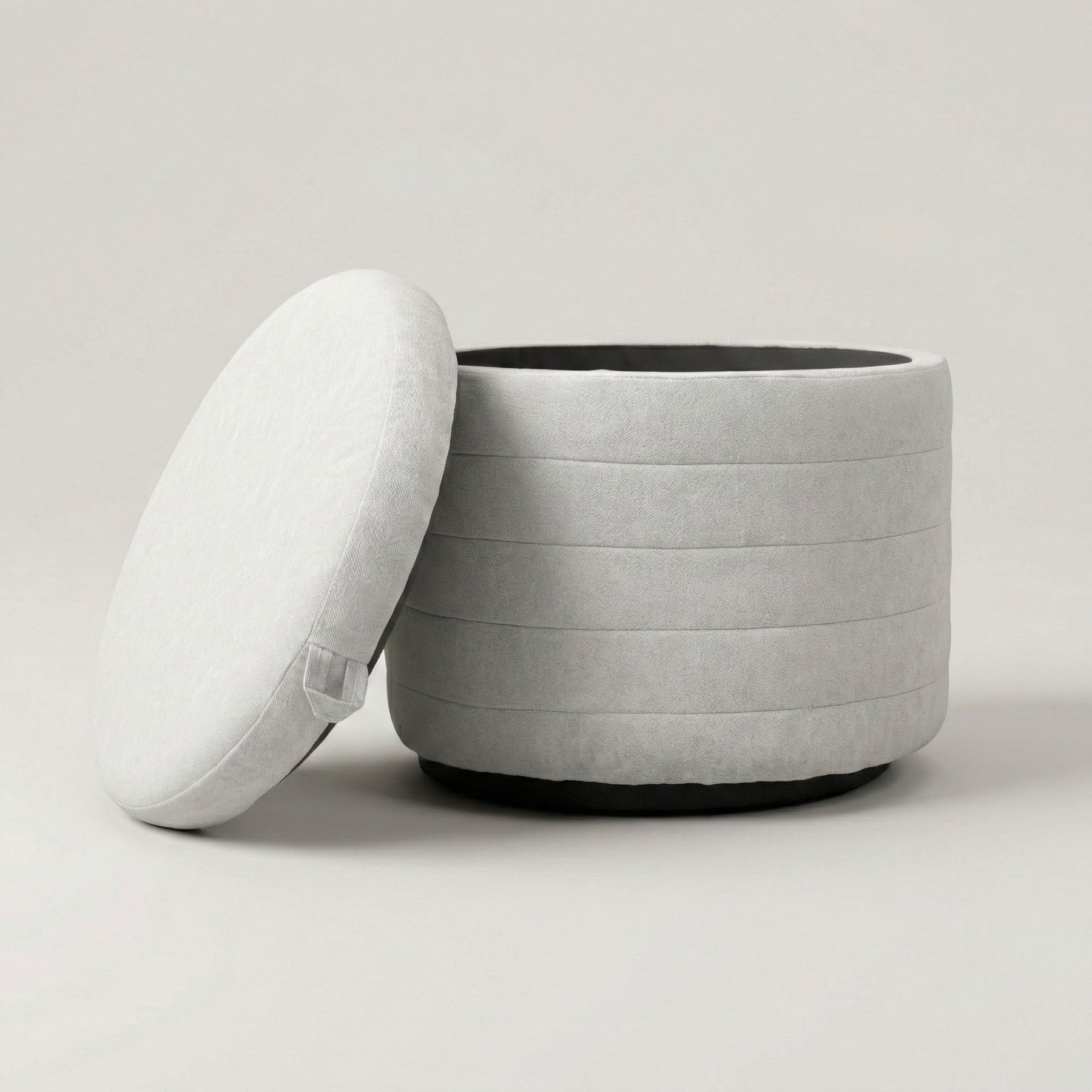 Round and versatile, this upholstered ottoman provides concealed storage in a compact form. A removable top reveals the ventilated interior.