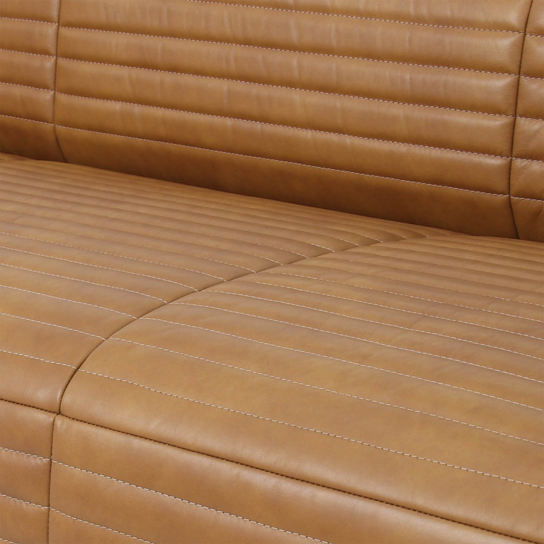 Defined by horizontal linework and a structured frame, this leather sofa offers a strong modern profile. Solid rubberwood legs ground the piece with natural warmth and strength.