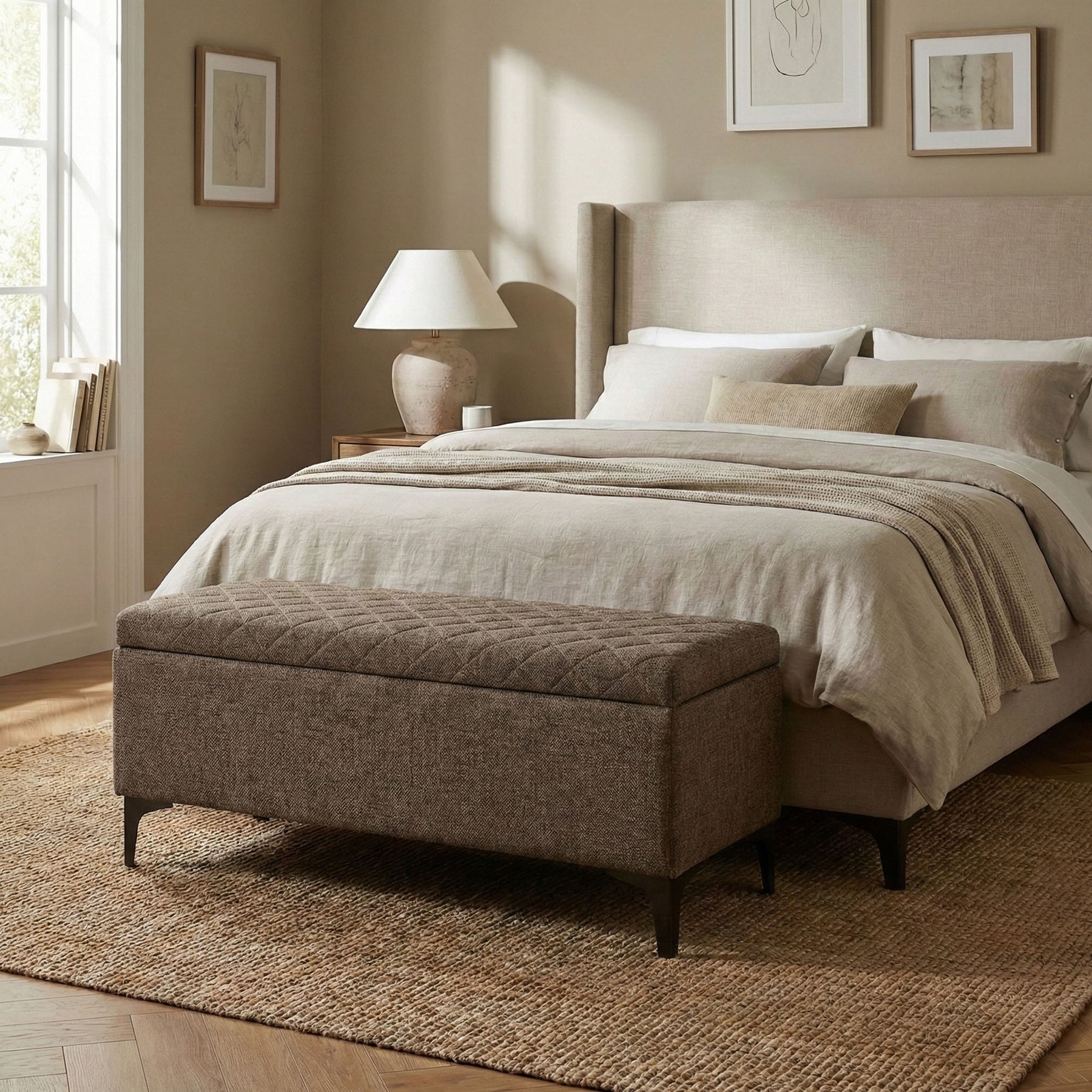 - Bid farewell to clutter. Lift the tufted lid to reveal a spacious interior, perfect for stowing away blankets, pillows, books, or any treasures you wish to keep close at hand yet neatly out of sight.
