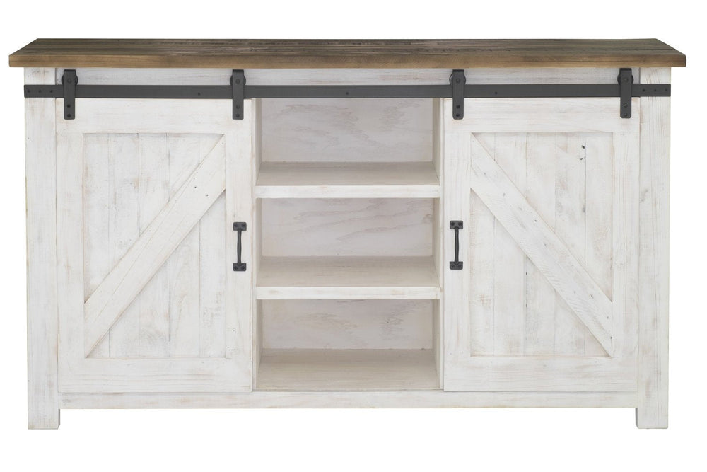 • This item embodies natural rustic charm. This collection features an antique white finish, farmhouse gliding doors and lots of room for storage!